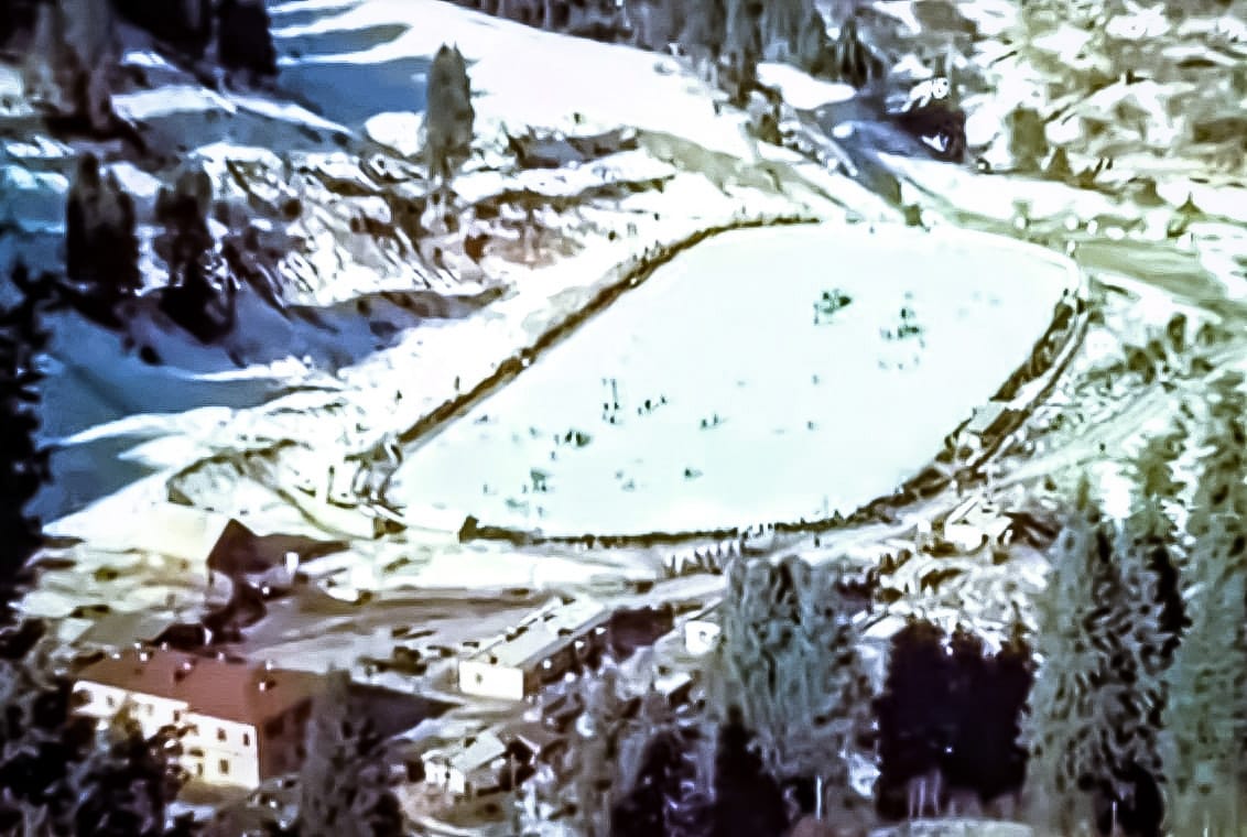 На фото из интернета вид на высокогорный каток Медео, вид с горнолыжной базы Чимбулак в начале 1960-х годов. Внизу, возможно, находиться столовая, в которой кормили на убой, и которая приносила одни убытки государству, со слов Высоцкого. Во время генеральной реконструкции все постройки снесут. Возле этого здания с 1972 года и по сегодняшний день, находиться резервуар с водой для заливки ледового покрытия, которое приходиться обновлять постоянно.