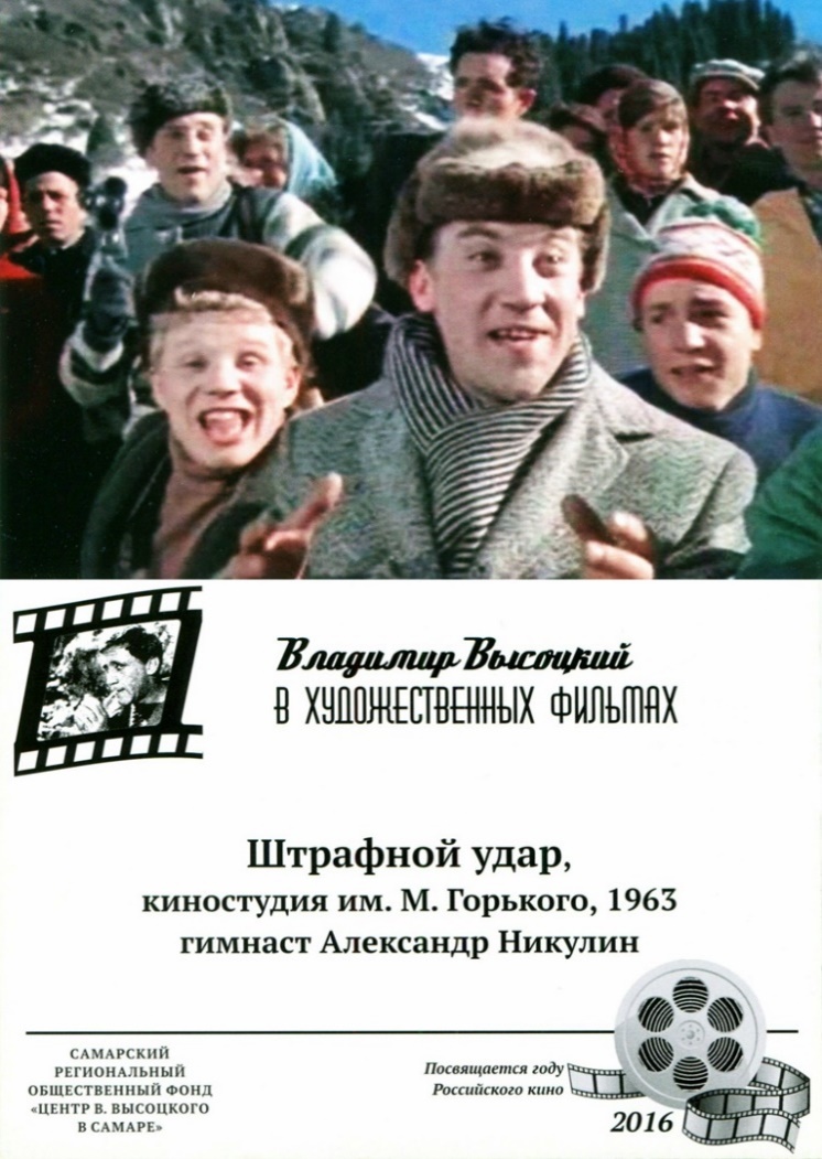 Перед нами раритет – открытка Самарского регионального общественного фонда «Центр В. Высоцкого в Самаре», вышедшая в 2016 году и напечатанная тиражом всего 300 экземпляров. Открытка является одной из серии «В. Высоцкий в художественных фильмах» и посвящена кинокомедии «Штрафной удар». Содержит ошибку в имени сыгранного героя – вместо гимнаста Юрия указан Александр Никулин, но интересна она не только этим.