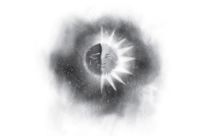Обиделась Луна, тяжело ранили её речи супруга. Так, слово за слово, они рассорились. Ударило Солнце в сердцах Луну, да с такой силой, что отломился от неё один бок и искрами разлетелся в разные стороны. С тех пор на небе сияют звёзды. В слезах убежала Луна от мужа на другой край небосклона, оставляя за собой белый шлейф. И эта дорога теперь называется Млечным Путём.