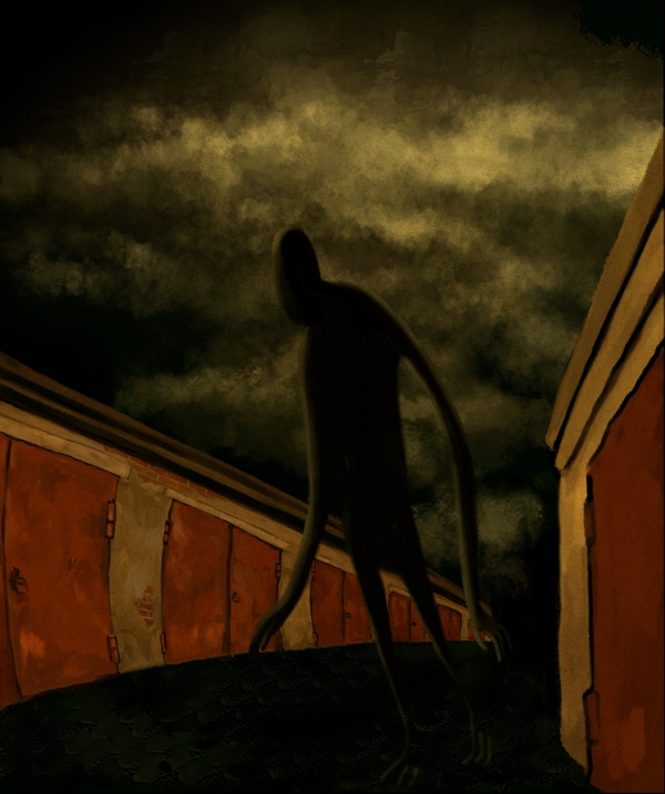 Оно шагало вдоль гаражей, волоча по земле длинные конечности. Высокое – выше гаражей. Два человеческих роста, не меньше. И само похоже на человека, чёрного, будто вылепленного из грязи. Голова странной формы, вытянутая вверх.