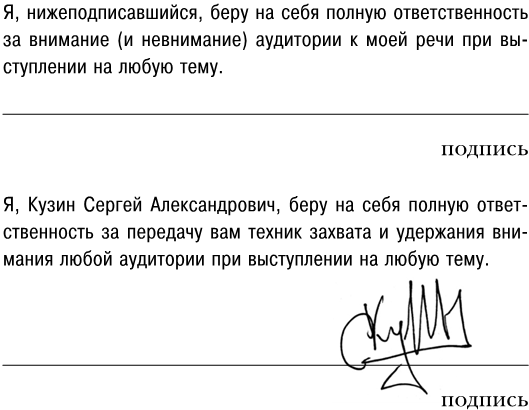 Если вы решаетесь на это, то делаете самый важный шаг к мастерству. Все остальное – дело времени и техники. Со второй частью я готов вам помочь. С вас – ответственность за внимание аудитории, с меня – техники внимания. Как вам такой договор? Если согласны, прошу подписать: