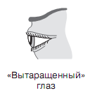 Тип глаза. «Вытаращенный»: выпуклый белок с кровавыми прожилками и желтоватым оттенком, ресницы короткие, брови топорщатся и расположены высоко.
