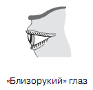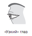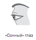 Тип глаза. «Узкий»: глаз находится в узкой глазной щели, без блеска, зрачок со слабой реакцией на свет. Брови в виде правильной дуги, ресницы длинные и редкие.