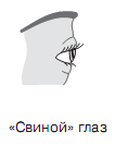 Тип глаза. «Свиной»: маленький глаз находится в очень узкой глазной щели, веки тяжелые, зрачок «бегающий». Брови и ресницы небольшие, редкие.