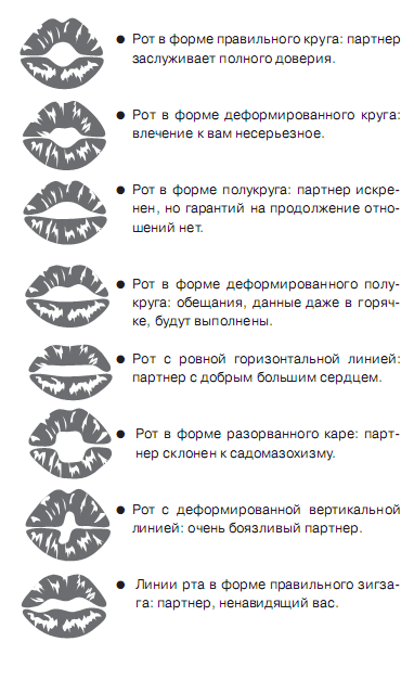 Покрасьте свои губы помадой и поцелуйте белый лист бумаги. А теперь сравните оттиск с представленными ниже образцами. Это позволит вам и вашей избраннице(-ку) узнать, как вы к ней (нему) относитесь.