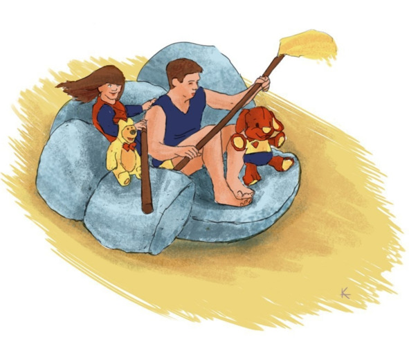 Постройте на полу каноэ из подушек (сгодятся и диванные подушки). Веслом может служить любая продолговатая палка. Спросите у ребенка, какие игрушки вы возьмете в путешествие. Поинтересуйтесь, где ребенок хочет сесть. Расположите пассажиров (игрушки), вручите каждому по веслу.