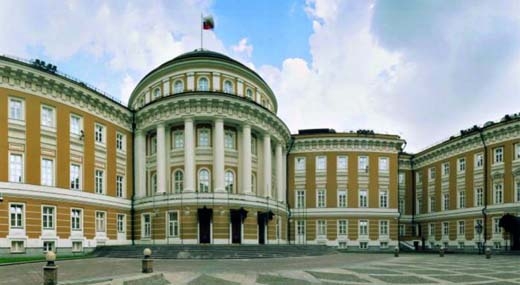 Огромное и величественное здание Сената построено при императрице Екатерине II по плану и под надзором архитектора Матвея Федоровича Казакова с 1776 по 1787 год. Здание построено треугольником на том месте, где некогда находились палаты князя Трубецкого и упраздненные церкви Св. Косьмы и Дамиана, Филиппа Митрополита и Введения во храм Богородицы. Длина здания 247 саженей. На постройку ушло 21 миллион кирпичей. Все здание обошлось в 759 тысяч рублей.