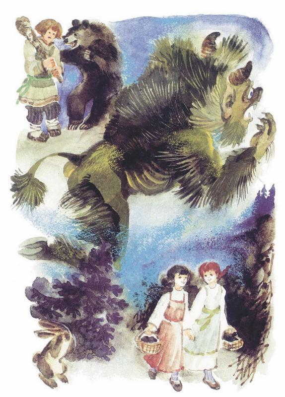 Бежит, видит: у дремучего пня-выворотня стоят с лукошками, полными ягод малины, две не шибко большенькие девчушки. Стоят, на все стороны смотрят испуганно.