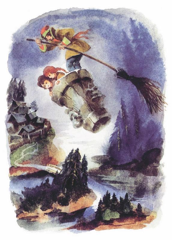 Ступа летит, Ваня метлой полёт направляет, девчушки от нового страха глаза крепко прижмурили.