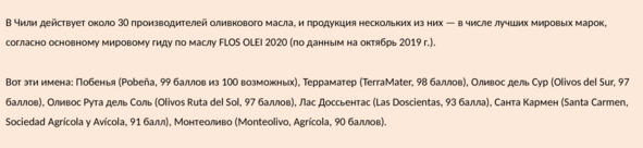 В 2019 г. в Чили увидел свет первый выпуск гида Guía Oliva, собрав лучших производителей масла Extra Virgen. Планируется, что этот гид будет выходить ежегодно.