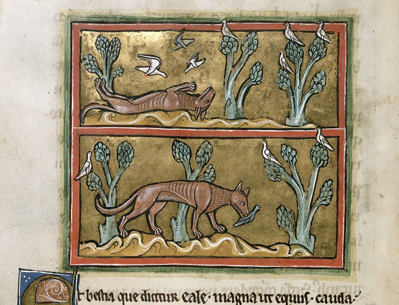 Изображение охотящейся лисы из Рочерского бестиария, XIII век