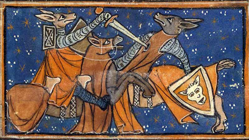 В средневековой Западной Европе истории о лисах были любимы не только в простом народе, но и среди знати, образованных слоёв населения. Из фольклора лисы «проникли» на страницы книг. В английском манускрипте «Рочерский бестиарий» (ок. 1230-1240 гг.) есть иллюстрация с изображением лиса, который, притворившись мёртвым, приманивает птиц: «Лиса – животное, про которое говорят «кружащиеся ноги». Лиса никогда не ходит прямыми путями, лишь извилистыми закоулками. Это коварное животное своими кознями завлекает добычу в ловушку. Когда лисе нечего есть, она притворяется мертвой, ловит и пожирает спустившихся к трупу птиц».