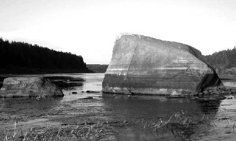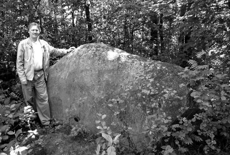 Два самых больших ледниковых валуна в восточной части Вологодской области – камни Лось и Утюг – находятся неподалёку от старинного города Тотьма. Лось лежит прямо в русле реки Сухоны, в 110 метрах от правого и в 190 метрах от левого её берега, примерно в 7 километрах ниже Тотьмы (фото 3: http:// rusmystery.ru/kamen-los-v-vologodskoj-oblasti/; рис. 26: © А. Кузнецов). Утюг же находится на склоне долины реки Еденьга, около деревни Старовская Пустошь (фото 4: © А. Кузнецов).