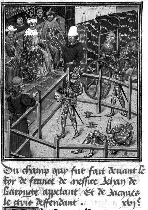 Парламент во Франции XIV в., как ни странно, был местом для дискуссий; точнее, для правосудия. Он вырос из Королевского совета и был в гораздо большей степени, нежели его английский тёзка, судом, чем законотворческим органом. Спор двух рыцарей привлёк его внимание, а король, чувствуя, что ситуация щекотливая, был рад «разделить ответственность». В результате спорящие стороны предстали во Дворце правосудия перед монархом и парламентом.
