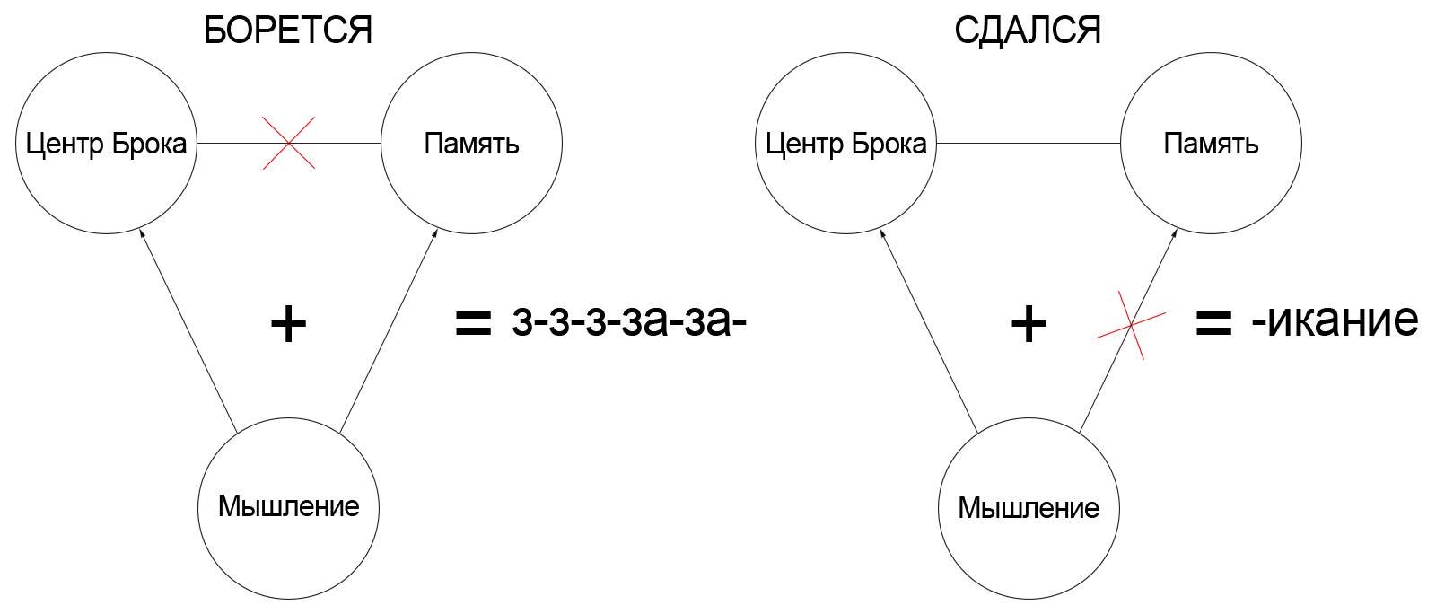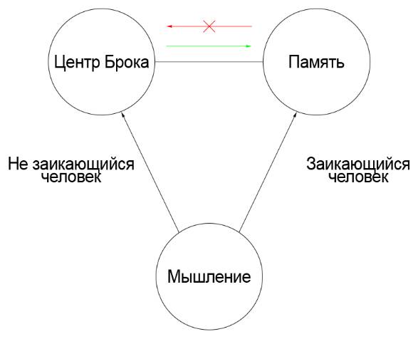 От центра Брока́ к памяти я нарисовал стрелку, означающую, что связь работает. А в обратную сторону – перечеркнутую стрелку, так как нельзя через память, по которой пытается говорить заикающийся человек, подключить центр Брока́ и начать разговаривать осмысленными предложениями. Работает только в первом варианте: речь создаётся в мышлении и произносится через центр Брока́, который использует память. Заикающийся человек не туда обращается.