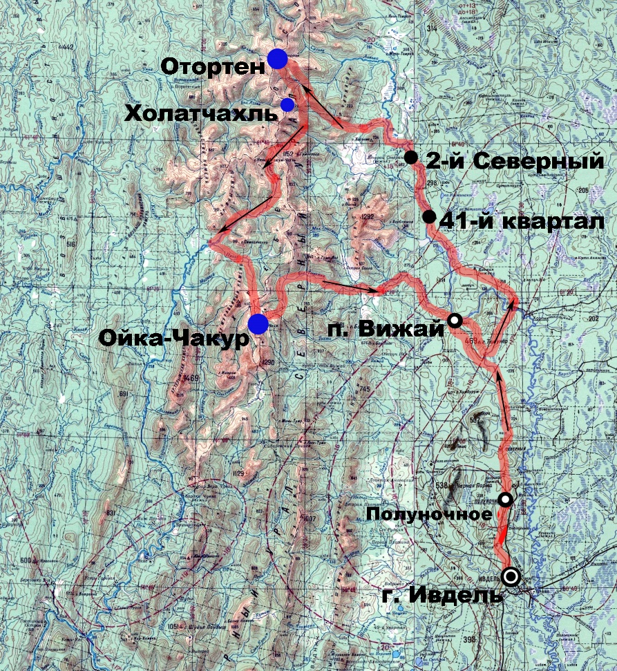 Описание района похода: Урал в тех местах представляет ряд параллельных хребтов со сглаженными вершинами, среди которых поднимаются высшие точки Отортен (1182), Гумпкалай (1152), Чистоп (1292), Ойка-Чакур (1279), Молебный камень (1296).