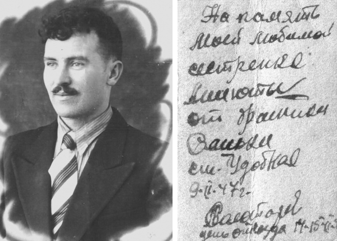 Фото 3. Семен Золотарев. Подпись на фото: на память моей любимой сестренке Анюточке от братишки Сашки, станица Удобная, 09.02.47 года