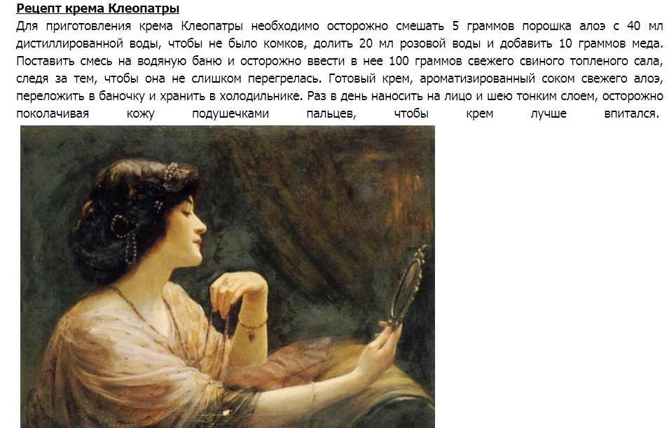 Подлинный секрет красоты состоял, по их мнению, в креме из алоэ. По сей день жительницы Северной Африки и острова Сицилия применяют в косметике мясистую часть этого растения.