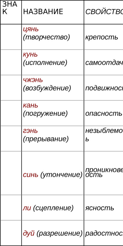 маньчжурски яксинь) – мантико-философская система древнекитайской протописьменности из 8-и знаков (гуа). Триграммы активно используются конфуцианством (жу-цзяо), меньше даосизмом (даоцзяо) и лишь отчасти китайским буддизмом (фоцзяо; в основном школой Чжэньянь). Триграммы были известны народам, попавшим в орбиту китайской цивилизации – как древних (тангуты, чжурчжэни, кидани), так и современных (вьетнамцы, японцы, монголы, корейцы, маньчжуры и др.). Каждый гуд состоит из трех черт (сяо) двух видов – сплошной и прерванной. Все 8 символов соотносят – ся с целым ассоциативным рядом свойств и образов (см. табл. 1). Вопреки нормам китайского письма триграммы пишутся снизу вверх («от земли») Очевидно триграммами передавались целые фразы, что сближает эти знаки с «пословичным письмом» (затц-шрифтом).