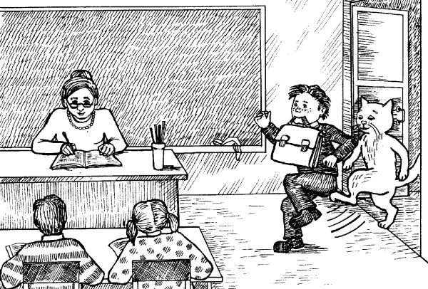 Одевшись наспех, заглотив на ходу бутерброд, уже с порога попрощавшись с мамой, Вовка рванул в школу. По дороге он увидел друга, поболтал с ним немножко, потом ему встретился старый знакомый – бродячий пес. Вовка поделился с ним куском бутерброда с колбасой, который положила ему в портфель заботливая мама. Прибежав уже после звонка, он долго мялся перед дверью класса, не зная, как оправдать свое опоздание. Но вот в конце коридора появилась фигура директора школы. Вовке пришлось срочно войти в класс: