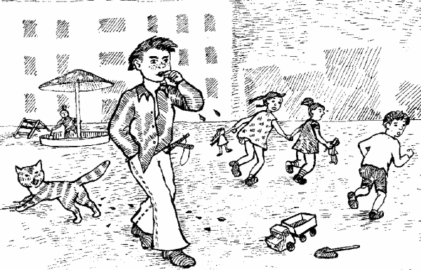 А со старшеклассниками он совсем круто разобрался – по-своему. Дело было так: однажды Вовка пил томатный сок из большой коробочки – любил он его, надо признаться. И вот пьет он сок и вдруг видит – прямо под окошком идет компания тех самых старшеклассников. Идут они и не ведают, что прямо над ними нависла угроза в виде коробочки томатного сока объемом в два стакана – на всех хватит! Рука мстителя не дрогнула, секунда – и весь сок перекочевал из коробочки (прямо вместе с ней) на головы и плечи, а главное, на одежду обидчиков.