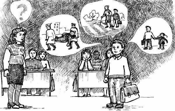 Я побежал прочь, но споткнулся и упал. Упал и очутился прямо в классе. А там все «наши» сидят, но не в виде людей, а тоже не поймешь кого. И тогда я становлюсь маленьким-маленьким, а они кидаются на меня. Я начинаю кричать и просыпаюсь.