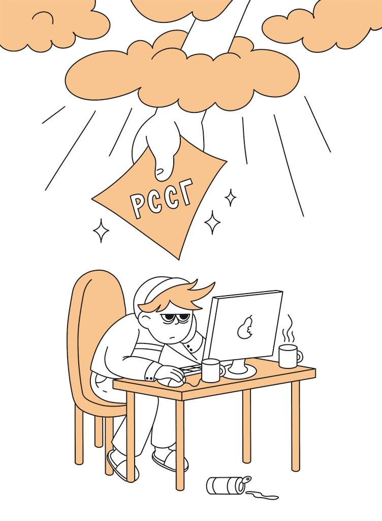 РССГ – Разреши Себе Сделать Говно. Мои студенты иногда кастомизируют эту аббревиатуру, и технику можно встретить в виде РССХ, но расшифровывать, пожалуй, не буду. Дизайнеры проходят разные этапы: иногда ты окрылён тем, что получилось, и радуешься как ребёнок, а потом отойдёшь от экрана на 20 минут, посмотришь свежим взглядом – и вот уже считаешь себя говном. А может быть и в обратном порядке. Вот такие вот качели. Присаживайся.