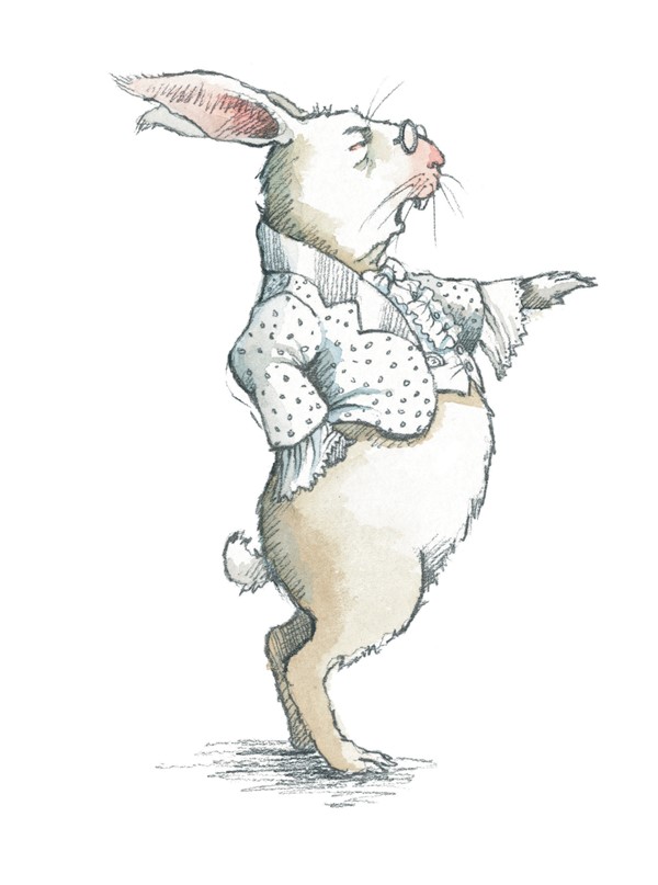 Но это была не Мышь, а Белый Кролик. Он медленно брёл назад и озабоченно оглядывался по сторонам, словно искал что-то. Алиса услышала, как он бормотал себе под нос: