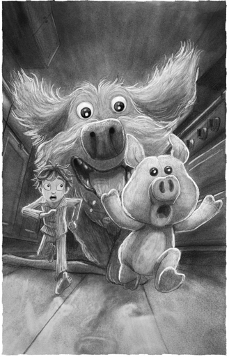 Закончить он не успел: на них выпрыгнуло гигантское четвероногое существо – чудище с огромными жёлтыми зубами, лохматой шкурой и сверкающими глазами. Басовито гавкнув, существо бросилось на Рождественского Поросёнка, поскользнулось на линолеуме и едва не схватило его огромными челюстями.