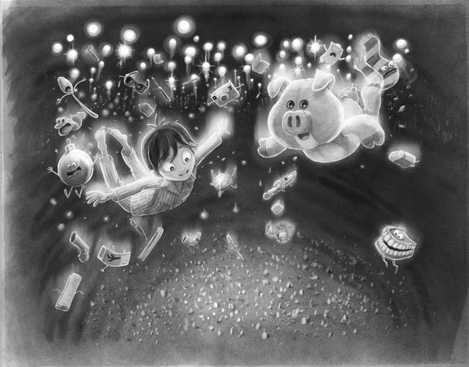 Когда стало ещё светлее, Джек понял, что находится в огромном помещении вроде склада, с очень высокими кирпичными стенами и множеством отверстий в деревянном потолке. Вещи, опустившиеся до конца – мячики и записные книжки, скрепки и кнопки, фотоаппараты, ручки и кошельки, – разбивались на группы и заводили разговоры. Джека всё это так заворожило, что приземление стало для него полной неожиданностью. Босые ноги встали на тёплый деревянный пол, а Рождественский Поросёнок опустился рядом, в проходе между кучей бренчащих ключей и целой армией шуршащих зонтиков.