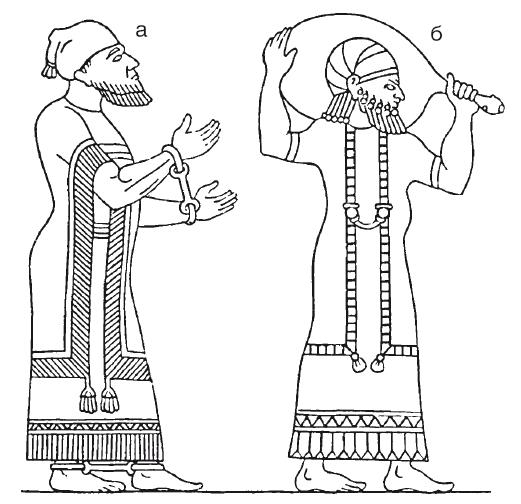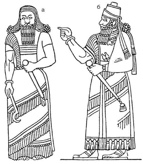 Рис. 38. Костюм ассиро-вавилонского жреца (а); царская одежда (б)