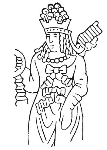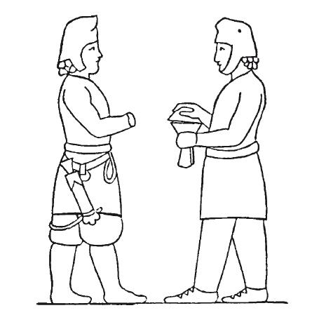 Совсем иным было платье монарха для участия в религиозной церемонии. Одежда первосвященника имела форму треугольника, а одеяние монарха (рис. 38, б) – прямоугольника; длина двух коротких сторон равнялась расстоянию от талии до ног. От одной из двух коротких сторон отрезали кусок, в результате чего получались два острия: прямоугольное и треугольное. Треугольное острие в нижней части одеяния отделывали бахромой по всему краю (рис. 40).
