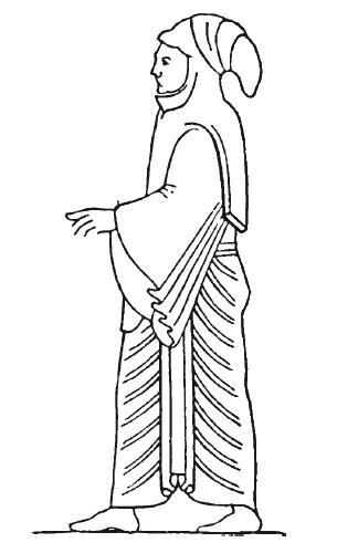 Тело обматывали тканью, как описывалось выше, – по восходящей спирали; вокруг тела образовывались косые складки, которые прятали под поясом. В процессе обматывания закрывалась спина, а задняя часть отреза доходила до затылка. Два острия закрепляли поясом, затем перебрасывали на плечи так, чтобы треугольным острием закрыть правое плечо и предплечье, а прямоугольным – левое плечо и почти полностью руку. Другой тип торжественного жреческого платья также представлял собой нижнюю рубаху длиной до колен, с короткими рукавами. Как и в остальных парадных костюмах, нижний край отделывался богатой тесьмой с кистями (рис. 37).