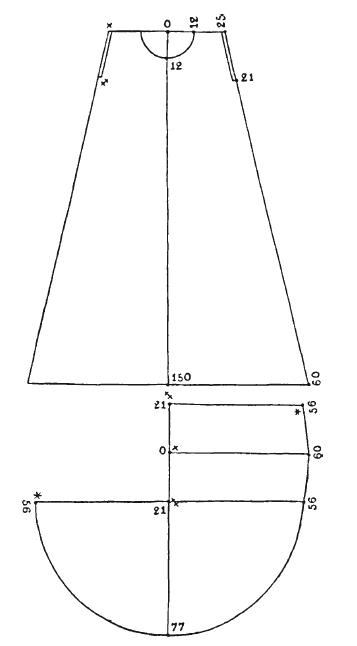 Верхнее платье мидян состояло из двух деталей – переда и спинки, выкроенных практически одинаковыми, за исключением того, что вырез для шеи делали на переднем полотнище. Оба полотнища расширялись книзу (рис. 49), были сшиты в плечах и по бокам. Рукава имели причудливую форму и вшивались в проймы в боковых швах (швы рукавов совпадали с боковыми швами). Крестами на рис. 49 обозначены точки сшивания рукава.