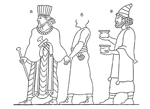 Во время церемоний в честь священного огня свита жрецов одевалась в пурпур. Пурпурное платье или по крайней мере пурпурная мантия были отличительной одеждой первосвященника (рис. 51, а). Исполняя церемонии, верховный жрец надевал национальный костюм мидян и головной убор, очень похожий на царский. Одежда остальных жрецов и фактурой ткани, и покроем напоминала персидские костюмы или состояла из нижней рубахи и накидки.