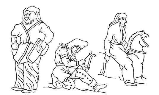Все скифские племена одевались примерно одинаково. Мужчины носили довольно широкие штаны и длинные распашные куртки с поясом. Куртки либо надевали навыпуск, либо заправляли в штаны. Из обуви скифы носили короткие сапоги, закрепленные вокруг лодыжек (рис. 53). Головной убор представлял собой или куполообразный кусок ткани, который удерживался шнуром, оборачиваемым вокруг головы, или заостренный колпак, как у фригийцев.