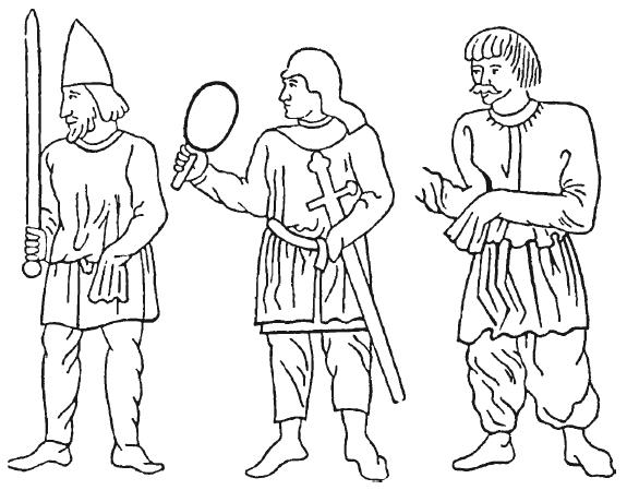 Обычное мужское платье сильно расширялось книзу и было таким длинным, что его приходилось подбирать спереди и по бокам и опоясывать (рис. 47). Рукава обтягивали предплечья и были очень широкими у запястий.