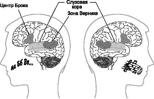 Ввиду того, что звуки речи и музыки с акустической точки зрения несут одинаковую информацию, наш мозг на первой стадии обработки практически не делает различий между ними. Если отвлечься от отдельных звуков, то речь в целом также имеет общие черты с музыкой. Последовательности из нескольких речевых звуков – т. е. слова и фразы – создают речевую мелодию, благодаря которой мы можем отличить вопрос от ответа. Кроме того, в речи создается ритм, который облегчает ее восприятие. Важны и смысловые ударения, позволяющие лучше понять содержание. Благодаря им мы различаем фразы «ПЕТЕР играет на скрипке» и «Петер играет на СКРИПКЕ». Основываясь на эмоциональной окраске звучания, мы можем определить настроение говорящего. Мелодия, ритм, ударение, интонация – это общие характеристики и музыки, и речи. Неудивительно, что мозг обрабатывает музыку и речь отчасти в одних и тех же своих структурах.