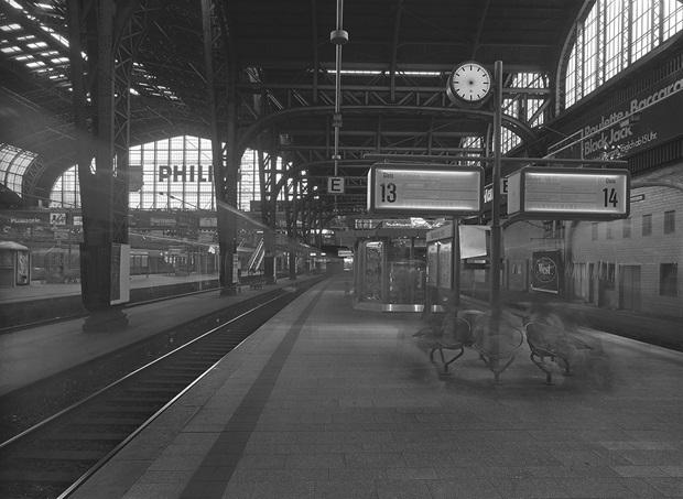 Наконец, есть еще и, пожалуй, концептуально наиболее убедительная работа Везели начала 1990‐х годов: серия фотографий, снятых с открытым затвором на немецких, австрийских и восточноевропейских железнодорожных вокзалах (ил. 2.3 и 2.4). Идея серии сравнительно проста, зато феноменологический, эстетический и политический подтекст отличается заметной сложностью. На каждом из снимков объектив камеры, установленной на платформе какой-либо станции (Прага, Берлин, Мюнхен, Гамбург, Ганновер), направлен на уходящий поезд, будто взгляд провожающего, чьего друга уносит прочь один из вагонов. Однако вместо того, чтобы выхватывать «решающий момент» отбытия, затвор камеры остается открытым до тех пор, пока поезд не прибудет на место назначения – Будапешт, Линц или Мюнхен – по расписанию, пять ли, семь или десять часов спустя. Продолжительная экспозиция дает удивительный и нередко жутковатый эффект. Мы всматриваемся сквозь призрачные очертания на переднем плане – бледные следы, оставленные пассажирами поверх отчетливого изображения скамейки, на которой они ждали поезда. Мы видим размытые светлые и темные полосы справа и слева, оставленные многочисленными поездами, успевшими проехать станцию за время экспозиции. Мы видим вокзальные часы: цифры запечатлены абсолютно четко, а стрелок не видно совсем из‐за их непрерывного движения; мы видим неподвижную информацию о пункте прибытия, раскрывающую местоположение фотографа, и сменяющуюся информацию об уходящих поездах, которая ничего не сообщает о пунктах назначения, поскольку никогда не отображается достаточно долго для того, чтобы отпечататься на галогенидосеребряной негативной пленке. Мы видим запечатленные во всех подробностях внушительные здания пражского, гамбургского и – в меньшей степени – берлинского вокзалов, этих памятников того, с каким размахом индустриальная цивилизация использовала рукотворные материалы – стекло и железо – для нужд суетливой и изменчивой современной эпохи. А не видим мы – несмотря на длительную экспозицию или, вернее, как раз из‐за нее – сколько-нибудь заметной разницы между ночью и днем, рассветом и сумерками. Вне зависимости от того, в ночь или навстречу дню отбыл поезд, железнодорожные станции на снимках Везели неизменно купаются в одном и том же свете, в рассеянном, нейтральном, абсолютно ровном освещении.