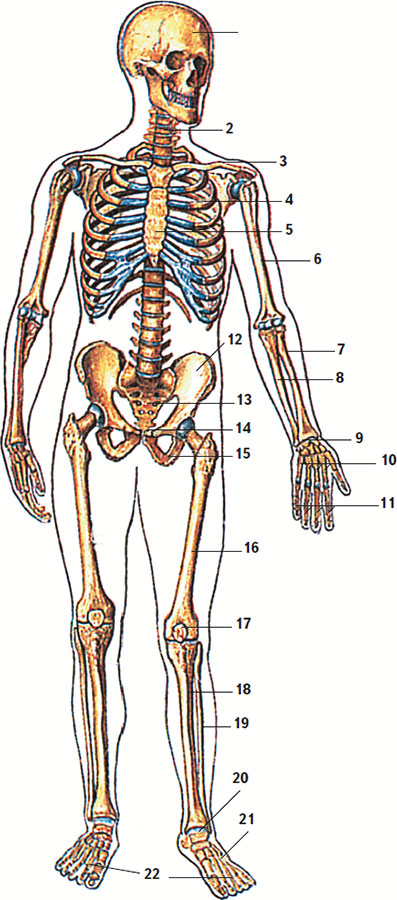 1 – череп; 2 – позвоночный столб; 3 – ключица; 4 – ребро; 5 – грудина; 6 – плечевая кость; 7 – лучевая кость; 8 – локтевая кость; 9 – кости запястья; 10 – кости пясти; 11 – фаланги пальцев кисти; 12 – подвздошная кость; 13 – крестец; 14 – лобковая кость; 15 – седалищная кость; 16 – бедренная кость; 17 – надколенник; 18 – большеберцовая кость; 19 – малоберцовая кость; 20 – кости предплюсны; 21 – кости плюсны; 22 – фаланги пальцев стопы
