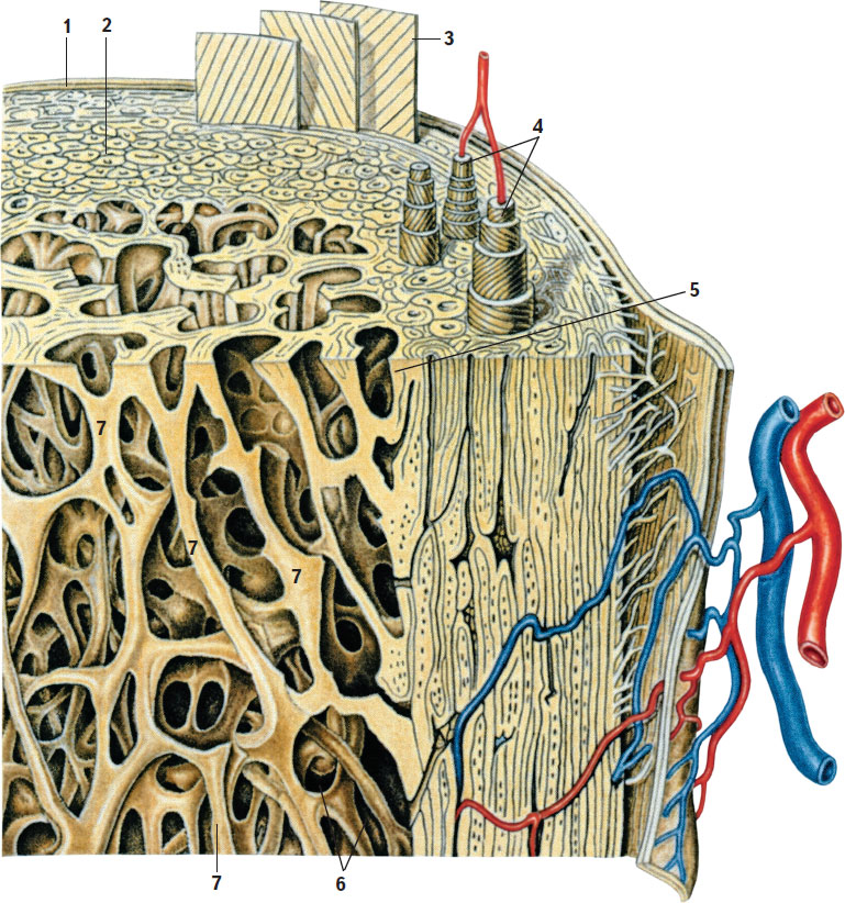 1 – надкостница; 2 – компактное вещество кости; 3 – слой наружных окружающих пластинок; 4 – остеоны; 5 – слой внутренних окружающих пластинок; 6 – костномозговая полость; 7 – костные перекладины губчатой кости