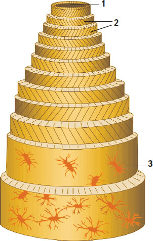 Остеон представляет собой 5–20 цилиндрических пластинок, вставленных одна в другую, в центре проходит центральный канал (гаверсов). Диаметр остеона составляет 0,3–0,4 см, длина – до 2-х см. В соседних пластинках одного остеона волокна ориентированы в разных направлениях, что увеличивает механические свойства кости, при этом пластинки соединены между собой переходящими из одной пластинки в другую дугообразными коллагеновыми волокнами, которые принадлежат пластинкам с продольным ходом волокон (рис. 8).