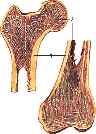 Рис. 9. Взаимоотношение компактного (1) и губчатого (2) веществ у проксимального и дистального эпифизов бедренной кости
