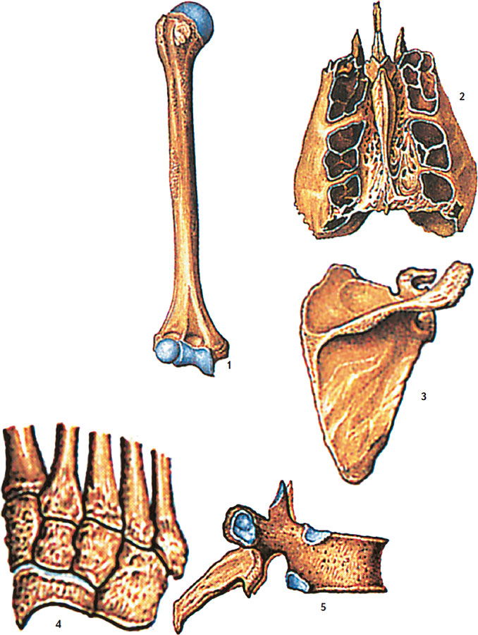 1 – длинная (трубчатая) кость; 2 – воздухоносная кость (решетчатая кость); 3 – плоская кость; 4 – губчатые (короткие) кости; 5 – смешанная кость