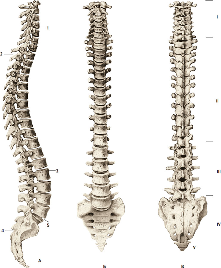 А – вид сбоку; Б – вид спереди; В – вид сзади. Отделы: I – шейный; II – грудной; III – поясничный; IV – крестцовый; V – копчиковый; 1, 3 – шейный и поясничный лордозы; 2, 4 – грудной и крестцовый кифозы; 5 – мыс