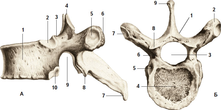А – вид сбоку: 1 – тело позвонка; 2 – верхняя реберная ямка; 3 – верхняя позвоночная вырезка; 4 – верхний суставной отросток; 5 – поперечная реберная ямка; 6 – поперечный отросток; 7 – остистый отросток; 8 – нижний суставной отросток; 9 – нижняя позвоночная вырезка; 10 – нижняя реберная ямка; Б – вид сверху: 1 – дуга позвонка; 2 – поперечный отросток; 3 – позвоночное отверстие; 4 – тело позвонка; 5 – верхняя реберная ямка; 6 – ножка дуги позвонка; 7 – реберная ямка поперечного отростка; 8 – верхняя суставная поверхность; 9 – остистый отросток