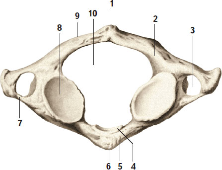 1 – задний бугорок; 2 – борозда позвоночной артерии; 3 – отверстие поперечного отростка; 4 – ямка зуба; 5 – передняя дуга; 6 – передний бугорок; 7 – поперечный отросток; 8 – верхняя суставная ямка; 9 – задняя дуга; 10 – позвоночное отверстие