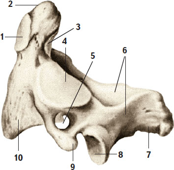 1 – передняя суставная поверхность; 2 – зуб; 3 – задняя суставная поверхность; 4 – верхняя суставная поверхность; 5 – отверстие поперечного отростка; 6 – дуга позвонка; 7 – остистый отросток; 8 – нижний суставной отросток; 9 – поперечный отросток; 10 – тело позвонка