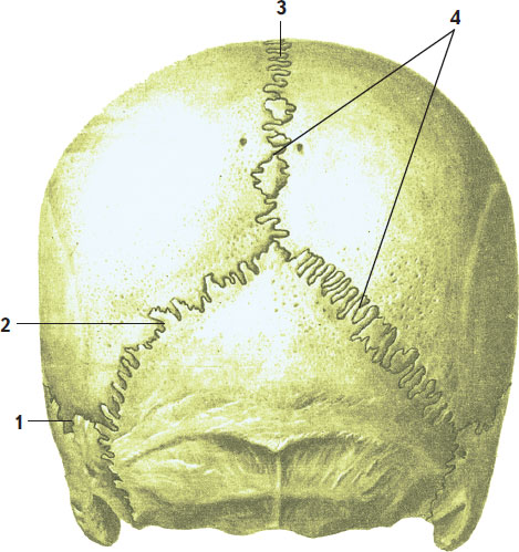 1 – передний родничок; 2 – клиновидный родничок; 3 – большое крыло клиновидной кости; 4 – лобный бугор; 5 – носовая кость; 6 – слезная кость; 7 – скуловая кость; 8 – верхняя челюсть; 9 – нижняя челюсть; 10 – барабанное кольцо височной кости; 11 – чешуйчатая часть височной кости; 12 – латеральная часть затылочной кости; 13 – сосцевидный родничок; 14 – затылочная чешуя; 15 – задний родничок; 16 – теменной бугор; 17 – лобный шов