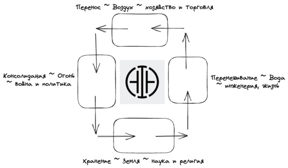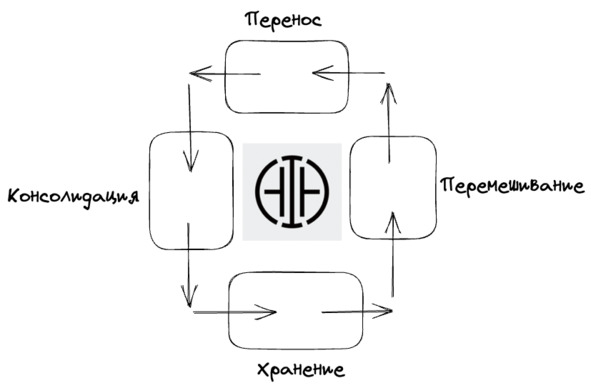 Заметим, что четыре отмеченных процесса не просто будут иметь указанные характеристики, но и будут находиться в строго определённой топологии. Разделение и перемешивание составляют агрессивную пару, а хранение и перенос – пассивную. Круговой порядок их расстановки подробно описан в первом томе.